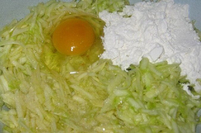 W małym pojemniku połącz cukinię, jajko, kaszą mannę, mąkę, a także sól i pieprz.