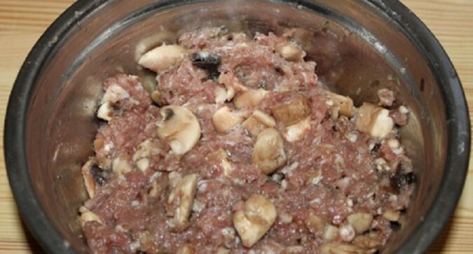 Pieczarki oraz cebulę drobno posiekaj, a następnie dodaj mięso mielone i usmaż aż do gotowości mięsa.