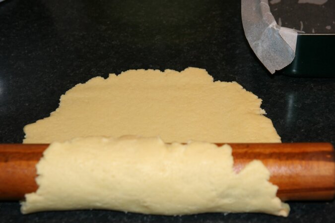 4. Posmarowaną formę wyłóż papierem do pieczenia, ciasto rozwałkuj na stole i za pomocą wałka przenieś na przygotowaną formę (20×30 cm).