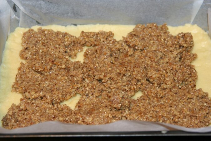 5. Na wierzchu rozłóż nadzienie, które pokryjemy kolejną warstwą ciasta.