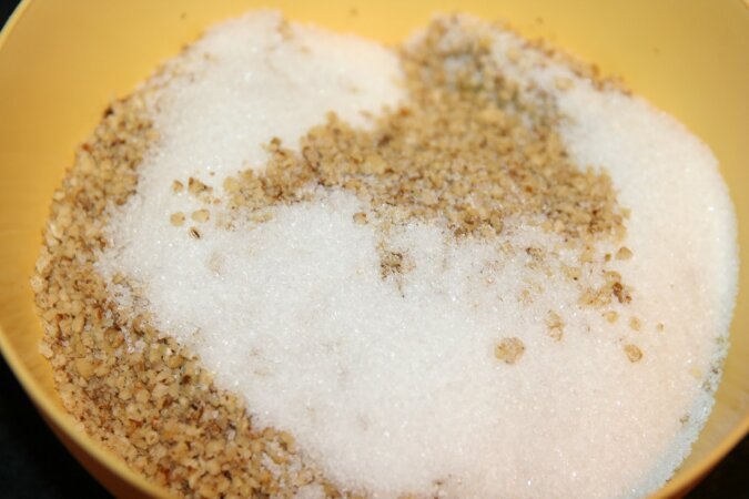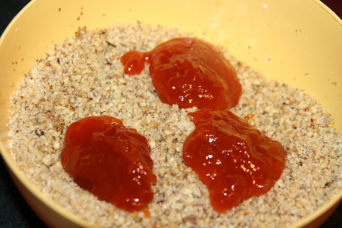 Zmielone orzechy połącz z cukrem, rumem, mlekiem i dżemem morelowym na gładką masę i odstaw.