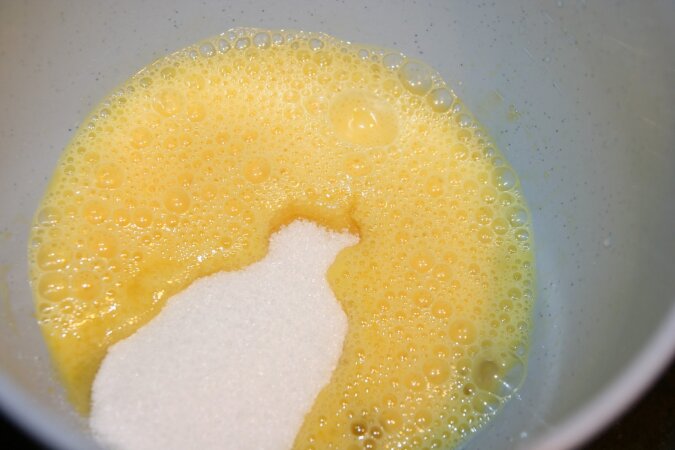 Dodaj cukier i wymieszaj, następnie żółtko i ponownie mieszaj przez 5 minut.