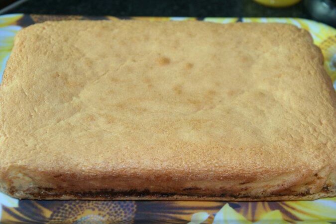 7. Po ostygnięciu ciasta przełóż je na inny talerz, następnie odwróć na kolejnym talerzu, aby nadać odpowiedni kształt, a następnie zacznij przygotowywać polewę czekoladową.