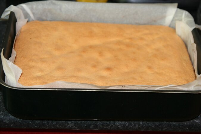 3. Przygotuj drugą warstwę: wymieszaj jajka z cukrem do jego rozpuszczenia (10-15 minut), dodaj mąkę i delikatnie wymieszaj łyżką od dołu do góry.