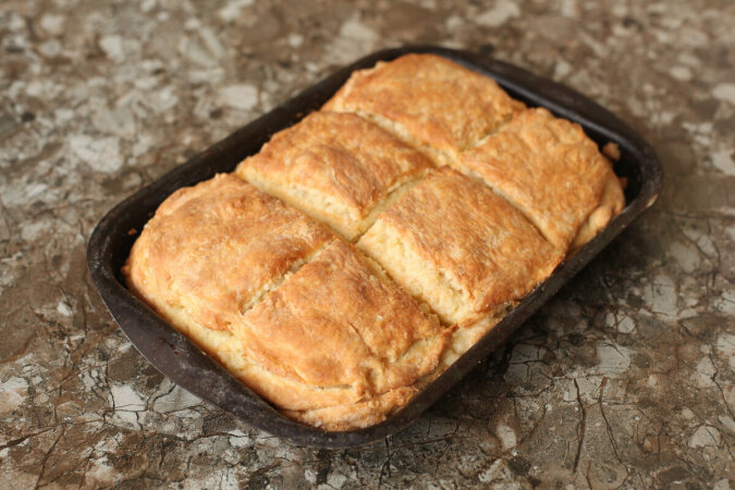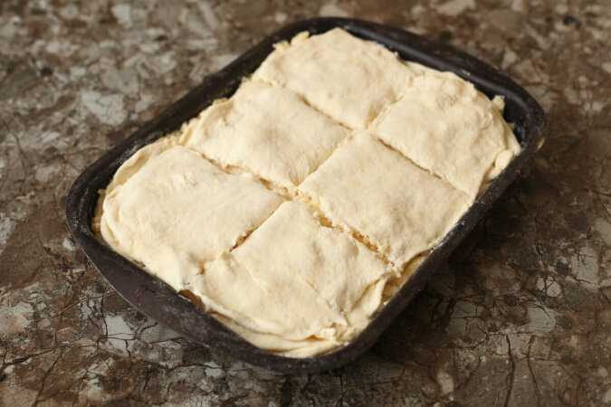 Teraz możemy zostawić wszystko tak jak jest, a następnie włożyć do rozgrzanego piekarnika. Właśnie w ten sposób regularnie przygotowuję ten smakołyk... Jednak według podanego przepisu, przed włożeniem do piekarnika ciasto należy pokroić i podzielić na kilka kawałków.