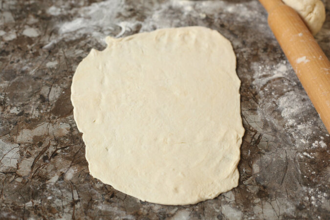 Po tym czasie należy wyjąć ciasto z lodówki, a następnie podzielić na 4 równe części. Teraz lekko posypujemy stół mąka, a następnie bierzemy 1 kawałek ciasta i rozwałkowujemy na grubość ok. 2-4 mm. Grubość ciasta zależy od rozmiaru blachy do pieczenia (formy do pieczenia). Ja posiadam blachę do pieczenia o rozmiarach 18 x 23 cm.