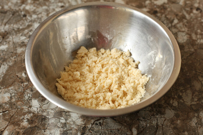 Wszystko mielimy rękami, aż uzyskamy drobne okruchy. Ważne jest, aby masło nie zaczęło się topić, w przeciwnym razie stosowanie okruchów nie przyniesie oczekiwanych efektów.