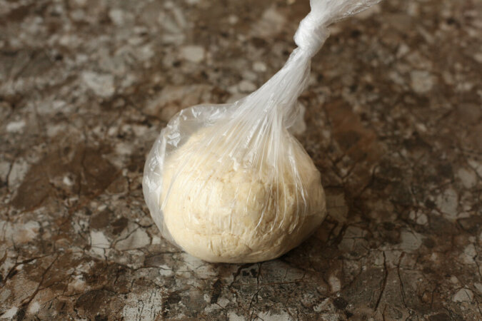 Ciasto wkładamy do foliowego woreczka lub zawijamy w folię spożywczą, a następnie wkładamy do lodówki na przynajmniej pół godziny.