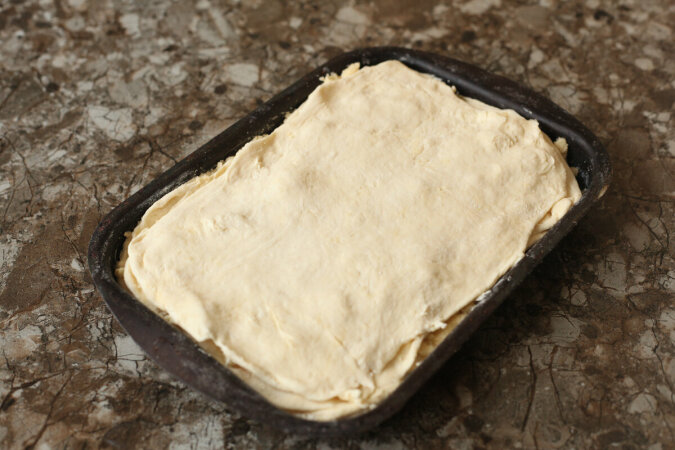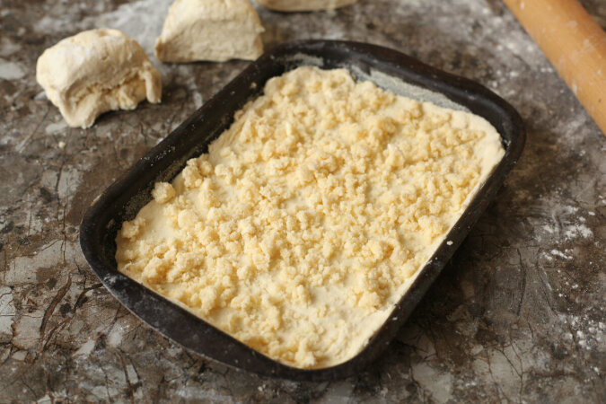 Blachę należy wyłożyć papierem do pieczenia, a także posmarować masłem, a następnie posypać kaszą manną. Zatem delikatnie wykładamy rozwałkowane ciasto na wierzchu. Wierzch ciasta posypujemy 1/3 okruchów.