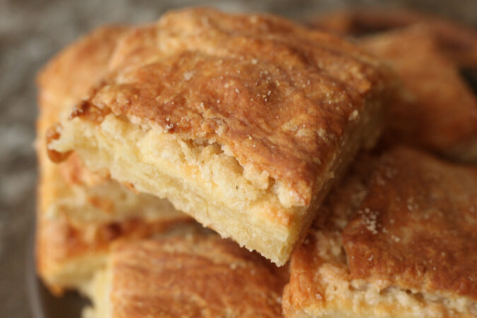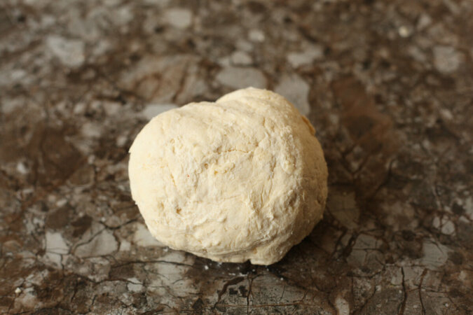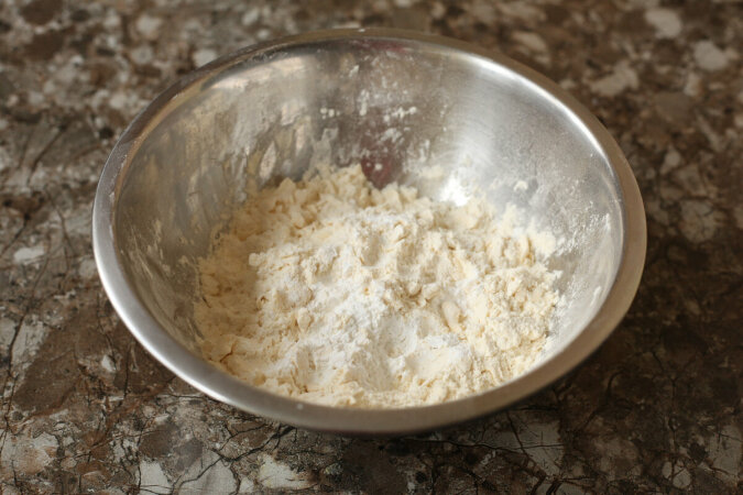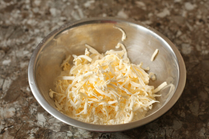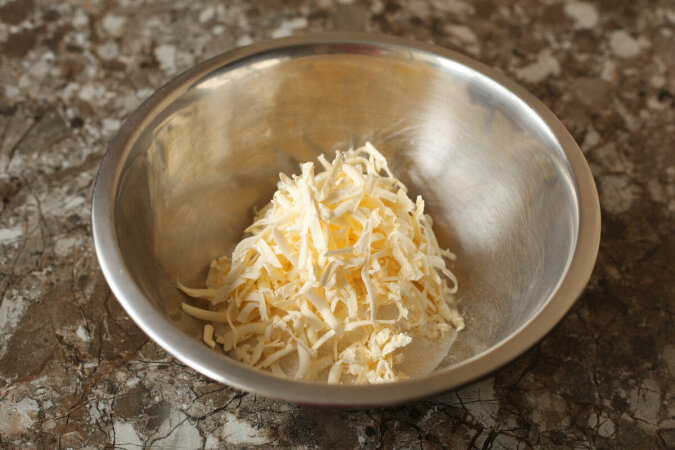 Najpierw bierzemy sią za przygotowanie ciasta, albowiem musi ono trochę „odpocząć”. Mąkę (250 g) należy przesiać do miski, a następnie kostkę dobrze zmrożonego masła natrzeć na tarce o grubych oczkach. Aby zapobiec przywieraniu masła do powierzchni tarki, kostkę należy kilka razy zanurzyć w mące pszennej. Przed gotowaniem zaleca się przechowywać kostkę masła w zamrażarce, aby dobrze stwardniało, ale nie zamarzło na kamień.