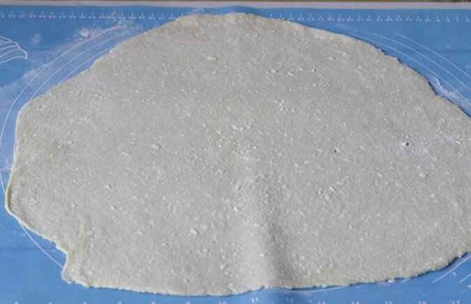 Teraz wyjmij schłodzone ciasto z lodówki, zatem posyp mąką, a następnie rozwałkuj w warstwę o grubości 3-5 mm.