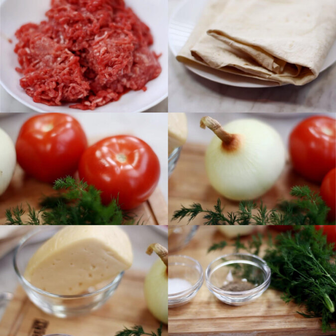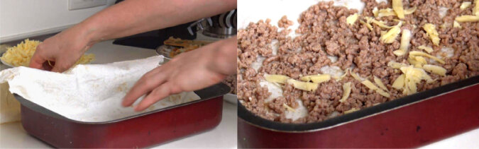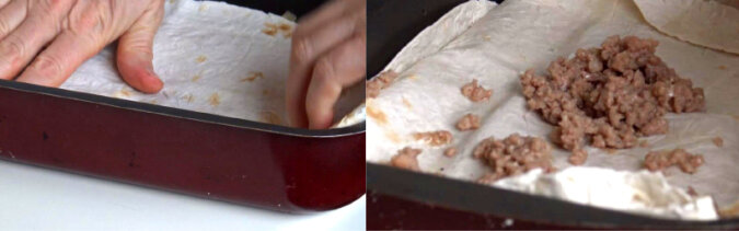Formę do pieczenia należy nasmarować olejem roślinnym, a następnie włożyć jeden arkusz chlebka pita, tak aby tylko jedna połowa znajdowała się w formie, a druga była na zewnątrz formy. Na arkuszu chlebka pita równo rozłożyć niezbyt grubą warstwą mięso mielone. Aby danie było bardziej pikantne, mięso mielone można posypać odrobiną startego zółtego sera na wierzchu. Arkusze chlebka pity mogą być dokładnie dopasowane do kształu formy do pieczenia porzez krojenie.