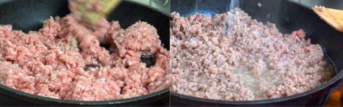 Mięso mielone usmaż na patelni na rozgrzanym oleju roślinnym. Czas smażenia jest dość krótki – ok. 4 minuty. Następnie dodaj sól i pieprz. Mięso mielone razem z sokiem odstaw na talerzu, by ostygło.