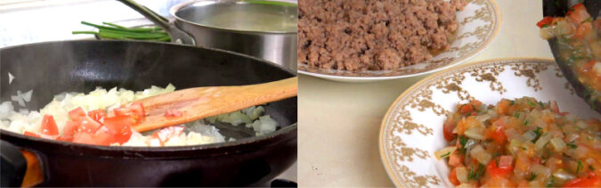 Cebulę i pomidory pokrój na małe kostki i usmaż na tej samej patelni. Pod koniec dodaj trochę zieleniny. Na talerzu rozłóż gotowe warzywa.