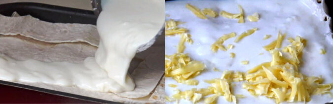 Aby zapewnić soczystość potrawie, należy starannie rozłożyć 3-4 łyżki sosu beszamelowego mlecznego. Pokryj tę warstwę drugą częścią chlebka pity.