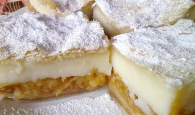 6. Wyłożenie przygotowanego budyniu na jabłka, położenie na budyń drugiej połowy ciasta francuskiego oraz pieczenie w 200 stopniach przez około kwadrans.