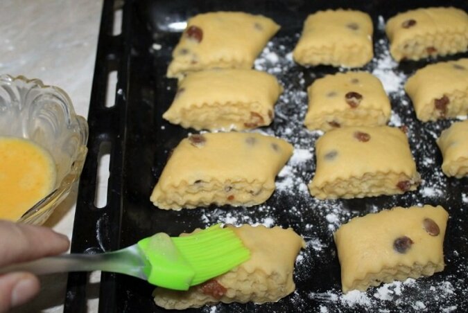 Blachę do pieczenia wyłóż papierem do pieczenia i poukładaj na niej ciasteczka. Wierzch każdego ciasteczka posmaruj rafinowanym olejem słonecznikowym lub ubitym żółtkiem.