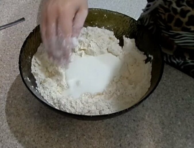 Do mieszaniny mąki i masła wlać kefir, a następnie należy dokładnie wyrabiać ciasto.