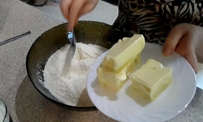 Połowę schłodzonego masła (nie ciepłego) wymieszaj z solą, sodą (nie gaszoną octem) oraz 3-ma szklankami przesianej mąki. Możesz wymieszać palcami mąkę i masło w głębokiej misce lub korzystać z robota kuchennego.