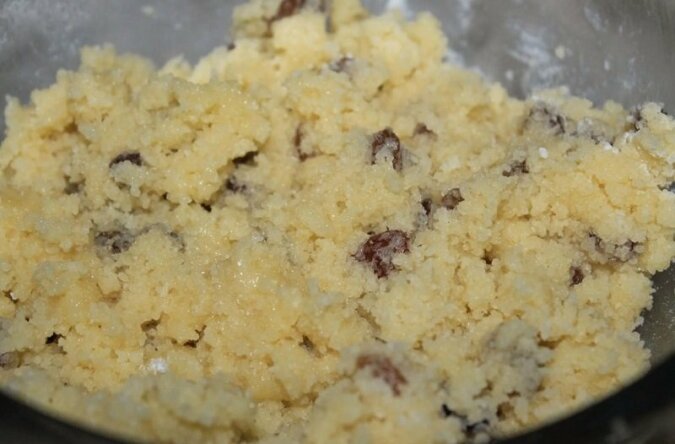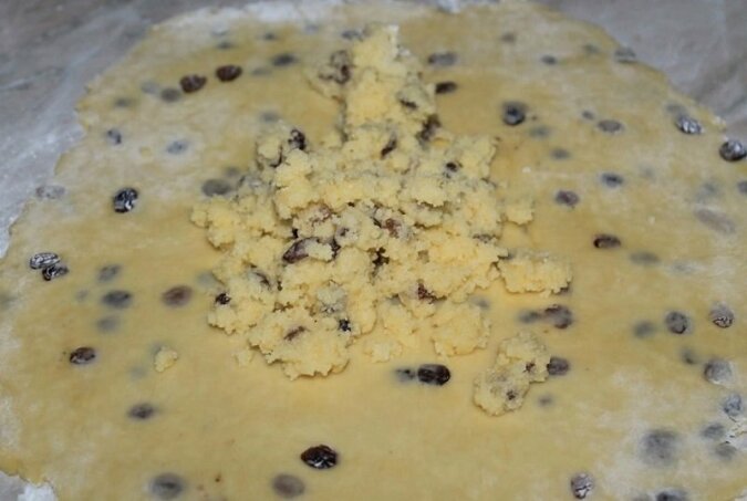 Teraz przygotowujemy nadzienie. Dlatego należy roztopić pozostałe masło, a zatem dodać 0,5 szklanki mąki, zwykły cukier oraz cukier waniliowy. Następnie zmielić orzechy i dodać do nadzienia. Zamiast orzechów można użyć rodzynek. Teraz należy dokładnie wymieszaj, aby masa była jednorodna. Nadzienie powinno być miękkie, aby mogło być dobrze rozprowadzone.