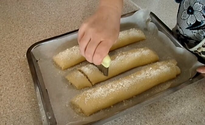 Za pomocą specjalnego noża pokrój rolkę na kawałki o szerokości około 3 cm.