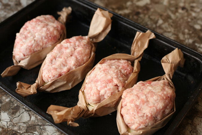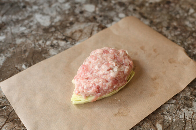 Następnie bierzemy część przygotowanego mięsa mielonego - można je od razu podzielić na równe części w ilości przygotowanych kawałków kapusty. Formujemy z mięsa kotlety i kładziemy na kapuście.