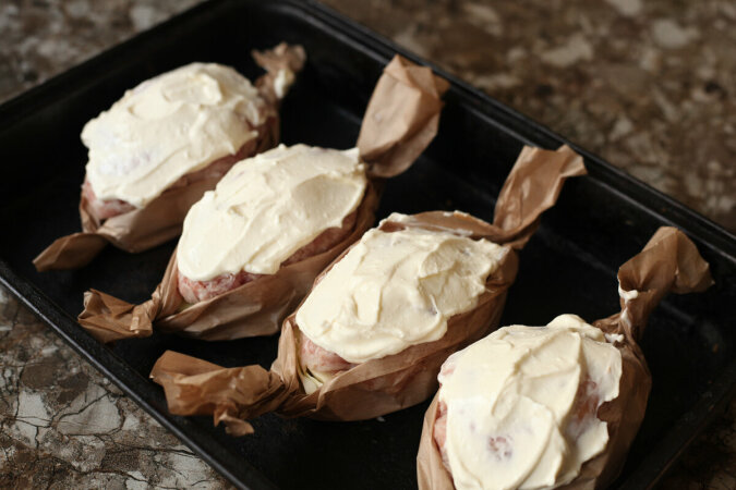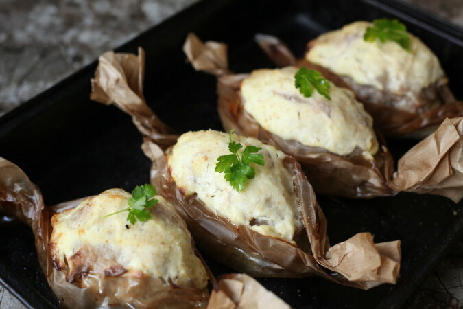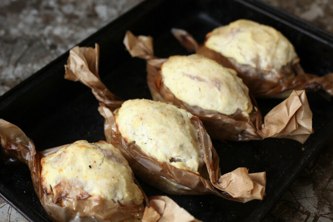 Danie wstawiamy do pieczenia w piekarniku nagrzanym do 180 stopni przez około 45-50 minut.