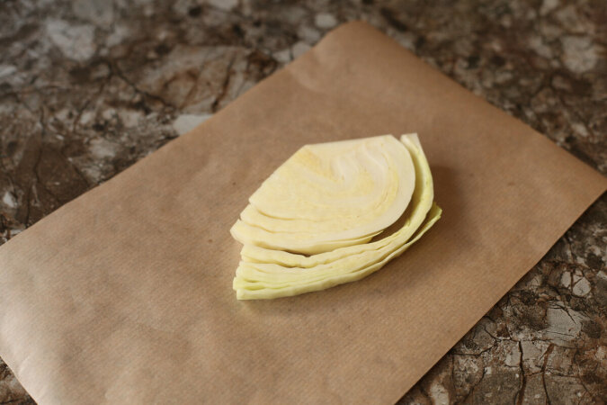 Teraz bierzemy jeden mały arkusz papieru do pieczenoa i kładziemy na nim 1 plasterek kapusty. Lekko rozsuń liście palcami, aby kapusta była dobrze upieczona.