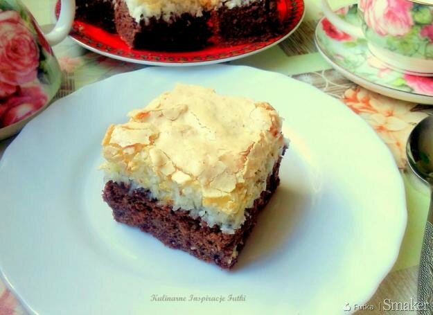 1. Wylanie ciasta na blaszkę oraz wyłożenie kokosowej masy białkowej..