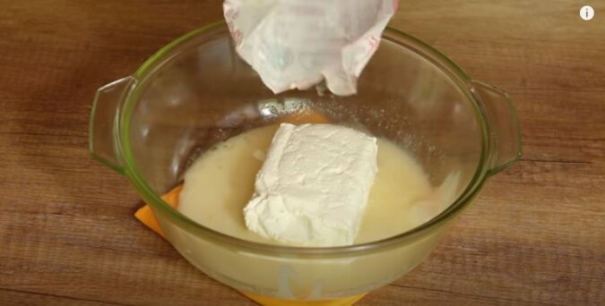 Wymieszaj jajko, sól, cukier i cukier waniliowy. Dodaj śmietanę, twaróg i dobrze wymieszaj za pomocą trzepaczki, aż masa będzie jednolita. Następnie dodaj dwie łyżki mąki z całej masy według przepisu, proszek do pieczenia i ponownie wymieszaj.