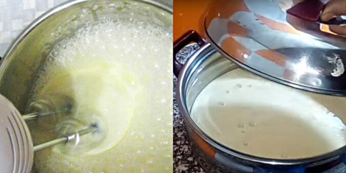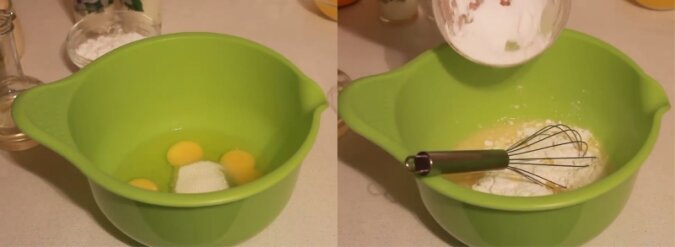 5 jajek ubijamy z cukrem. Dodajemy skrobię, a następnie dokładnie mieszamy. Należy upewnić się, że nie ma grudek.