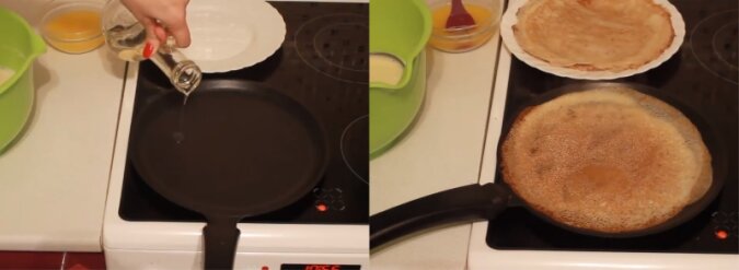 Gdy ciasto zwiększy swoją objętość o 2 razy, należy go wlać do lekko rozgrzanej patelni bez tłuszczu. Ciasto wlewaj dokładnie na środku i nie rozprowadzaj po całej powierzchni patelni, w przeciwnym razie naleśniki nie będą bulgotać. Smażyć naleśniki należy na średnim ogniu i tylko z jednej strony.