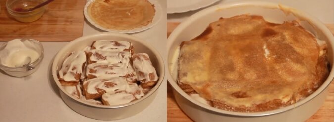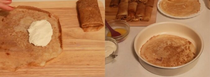 Naleśniki ułóż w dwie warstwy w formie do pieczenia. Połóż jeden naleśnik na dnie formy. Każdą warstwę posmaruj roztopionym masłem i kwaśną śmietaną. Na wierzchu naleśniki przykryj kolejnym naleśnikiem.