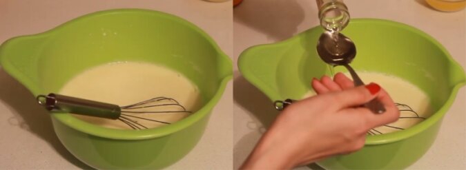 Do miski wlej mleko i olej słonecznikowy. Dokładnie wszystko wymieszaj. Musimy uzyskać rzadkie ciasto. Pozwól ciastu się zaparzyć przez 15 minut.