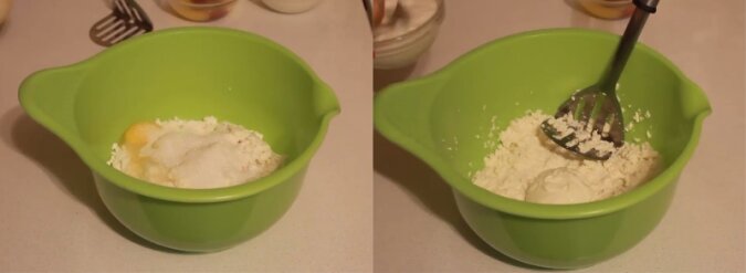 Teraz przygotowujemy nadzienie. Mieszamy twarożek z cukrem i jednym jajkiem. Następnie dodajemy wanilinę, śmietanę i znowu dokładnie mieszamy. Jeśli chcesz możesz dodać swoje ulubione owoce suszone oraz orzechy.