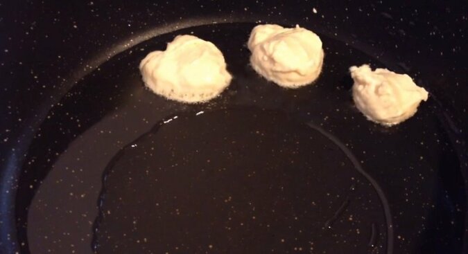 Wlej jedną niepełną łyżkę ciasta na patelnię, formując okrągłe placki. Gdy podczas smażenia na górnej części racuchów pojawia się dziury, podważ za pomocą płaskiej szpatułki i przewróć na drugą stronę.