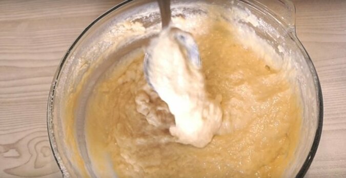 Mąkę i kefir mieszamy trzepaczką aż do powstania jednorodnej masy. Jeśli ciasto nie jest wystarczająco gęste, możesz dodać mąkę. Ciasto powinno uzyskać konsystencję bardzo gęstej śmietany.