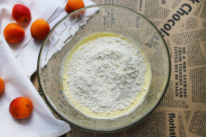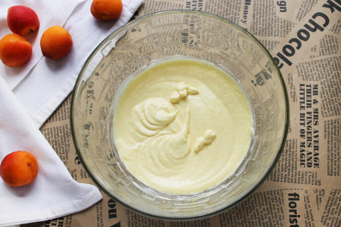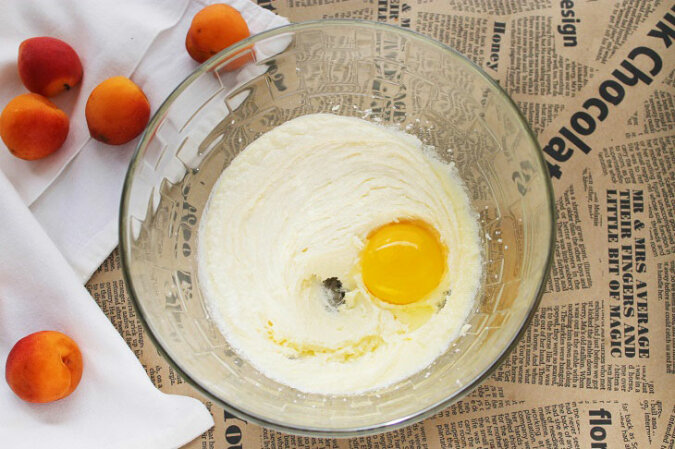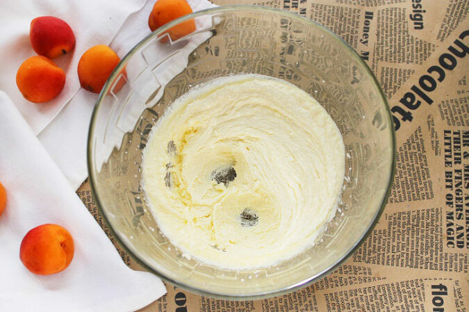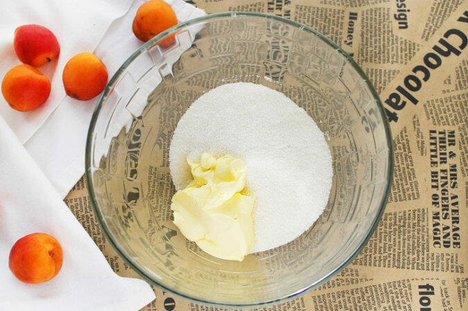 Wyciągnij masło z lodówki co najmniej 20-30 minut przed rozpoczęciem robienia ciasta. Powinno być miękkie. Umyj i osusz morele. Pokrój każdy owoc wzdłuż na dwie połówki i usuń pestkę.