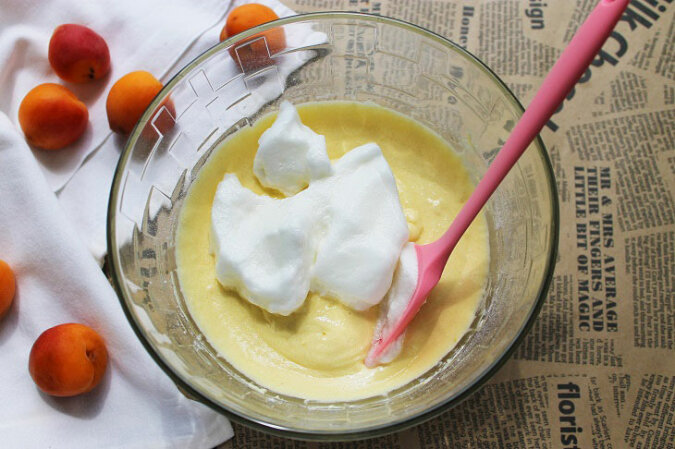 Umieść jedną trzecią białek w misce z ciastem. Delikatnie mieszaj łopatką, przesuwając od góry do dołu od krawędzi do środka, obracając miskę zgodnie z ruchem wskazówek zegara. Następnie w ten sam sposób wymieszaj kolejne 2 porcje masy białkowej. Jeśli do ciasta dodasz 1 łyżkę koniaku lub rumu, ciasto będzie jeszcze bardziej aromatyczne.
