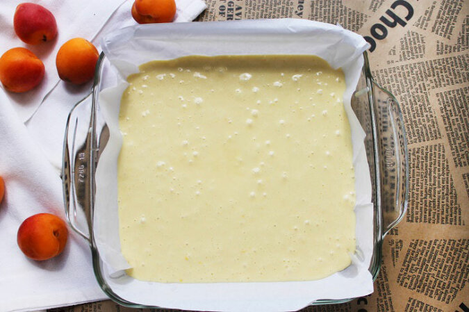 Rozłóż połówki moreli, ściętą stroną do góry, na powierzchni ciasta.