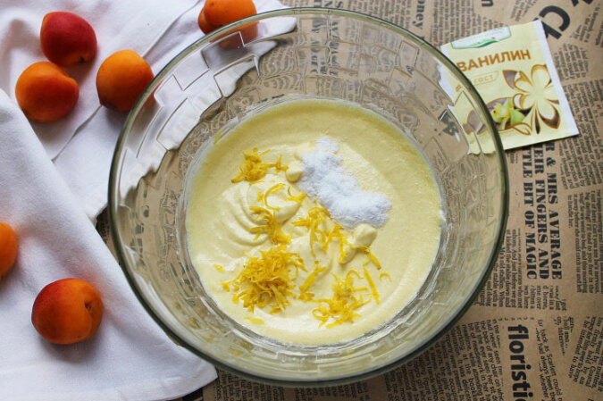 Podstawą ciasta jest delikatne ciasto biszkoptowe z dodatkiem masła. Nadzienie jest przepyszne - soczyste, pachnące połówki świeżych dojrzałych moreli. Jako dodatki aromatyczne stosuje się cukier waniliowy i świeżą skórkę cytryny.