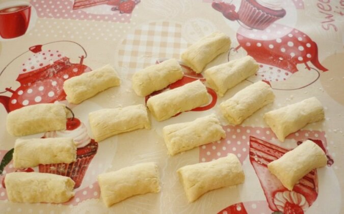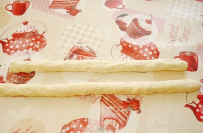 Uzyskane ciasto należy rozwałkować na cienkie kiełbaski.