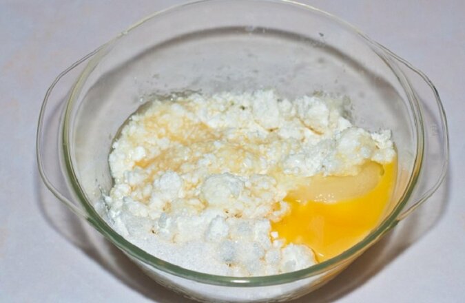W głębokiej misce łączymy twarożek z jajkiem, śmietaną, cukrem, sodą, proszkiem do pieczenia, solimy, a także dodajemy wanilię i mąkę. Wszystkie składniki dokładnie mieszamy. Możesz potrzebować trochę mniej lub więcej mąki, bowiem wszystko zależy od konsystencji twarogu.
