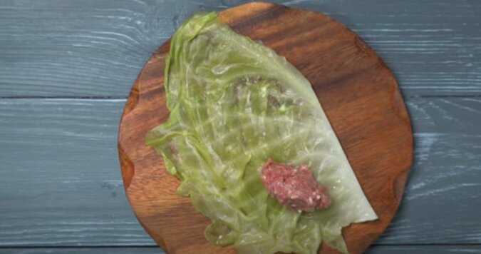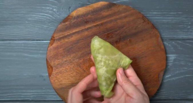Na liść kapusty nakładamy farsz i zwijamy w trójkąt.