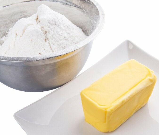 Dwie łyżki mąki potrzebne do przygotowania kremu, a resztę mąki połącz ze zmiękczonym masłem, wlej pół szklanki wody do tej mieszanki oraz dobrze wymieszaj.