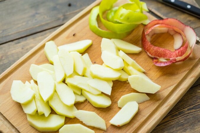 Umyj jabłka w wodzie, usuń rdzeń, obierz skórkę, a następnie pokrój jabłka w cienkie plasterki. Postaraj się przygotować różne odmiany jabłek. Idealne na jabłecznik są słodko-kwaśne odmiany jabłek. To sprawia, że smak tego deseru jest bogatszy i bardziej naturalny.