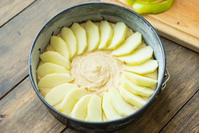 Wyłóż krem na ciasto z jabłkami, a następnie wstaw do piekarnika nagrzanego do 200 stopni Celsjusza i piecz około 40-50 minut. Sprawdź gotowość za pomocą drewnianego szpikulca.