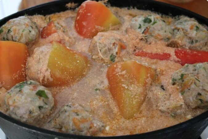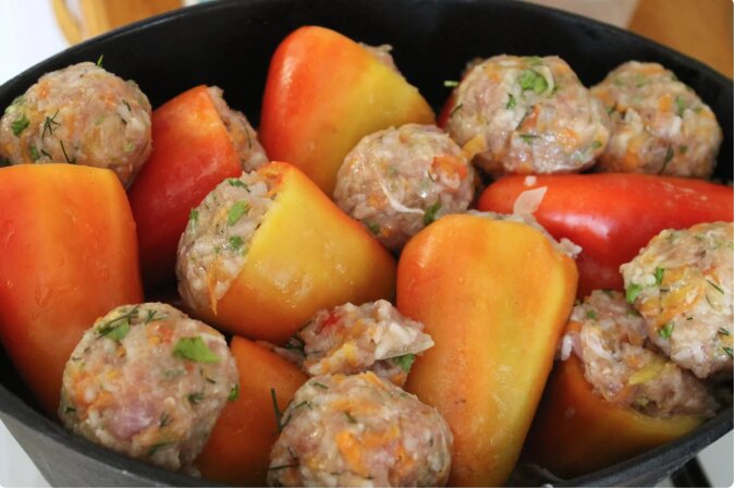 Papryki szczelnie wypełniamy farszem, wkładamy do odpowiedniego grubościennego garnka, z resztek mięsa mielonego, jeśli są, można zwinąć „klopsiki” i położyć je na papryki. Możesz też usmażyć to na patelni i zjeść podczas przygotowywania dania głównego. Zalej paprykę wodą nieco ponad połowę, wstaw na ogień, doprowadź do wrzenia, zmniejsz ogień do minimum, przykryj pokrywką i zostaw.