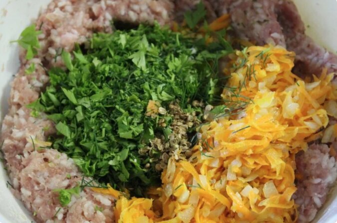 Drobno posiekaj zieleninę, miałem natkę pietruszki, seler, koper i kolendrę, i wszystko dodaj do mielonego mięsa.