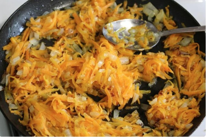 Drugą cebulę umyj, pokrój, podsmaż w niewielkiej ilości oleju roślinnego do przeźroczystości, dodaj marchewkę startą na tarce o grubych oczkach, doprowadź do miękkości i dodaj do mielonego mięsa.